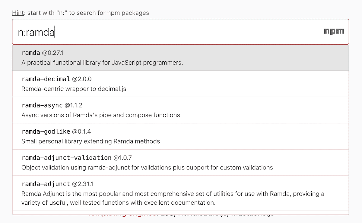 Search for npm packages was preserved and users could activate it with a simple n: prefix. I added a hint above the search field to let users know about that possibility.