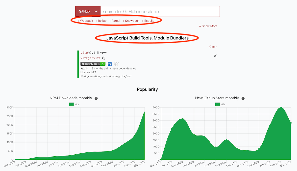 Then I checked statistics and found that only 10% of searches are npm-searches. It looked strange to me, because I believe most of Moiva users at this stage come from JavaScript ecosystem and they should be interested more in searching for NPM packages rather than GitHub repositories. Search for NPM packages has one advantage - users can see NPM-related statistics like NPM Downloads and NPM releases.
