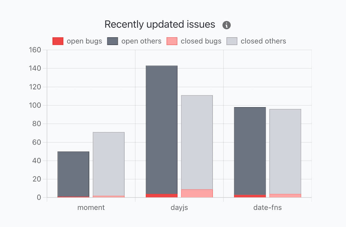 Later on, I discovered I was wrong. I examined data from a number of well-known repositories and noticed that many old closed issues were constantly being updated, primarily due to new comments. It made the issues appear in Moiva as "recently closed", undermining the chart's main purpose.