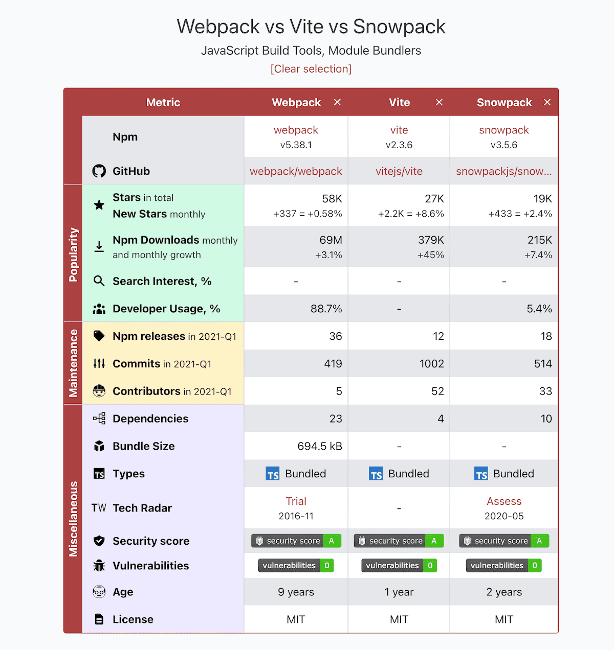 Moiva evaluates Npm packages and GitHub repositories using roughly 20 metrics. And the number keeps growing. To help users navigate through those metrics, I grouped them into three categories: "Popularity", "Maintenance" and "Miscellaneous". Each category got highlighted with a different background color.