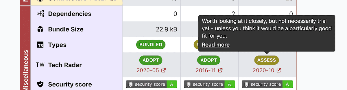 metrics "Types", "Tech Radar" and "License" were converted into badges of different colors depending on the value