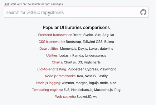 - ability to search for and get data for any GitHub repository in addition to search and comparison of NPM packages.